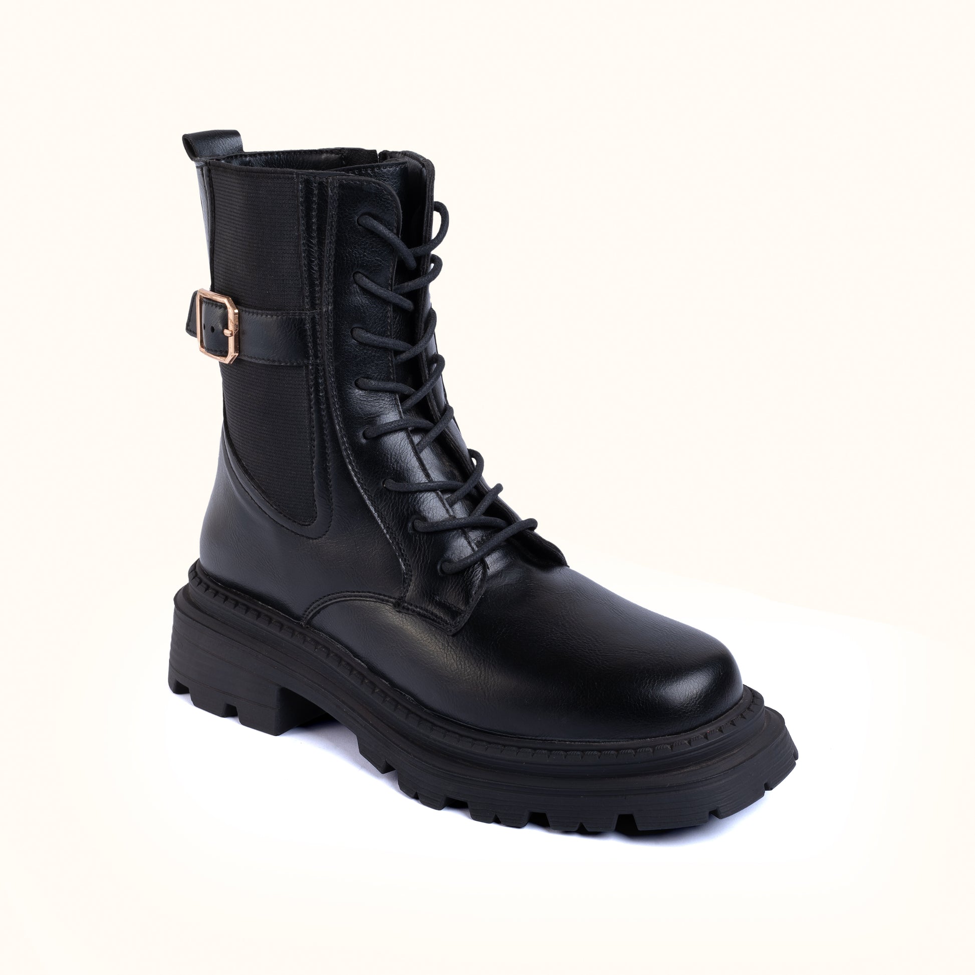 A modern BLACK boot featuring a sleek lace-up design and a bold side buckle detail. Its structured shape and elevated sole give it a refined yet edgy look, perfect for standout everyday style.