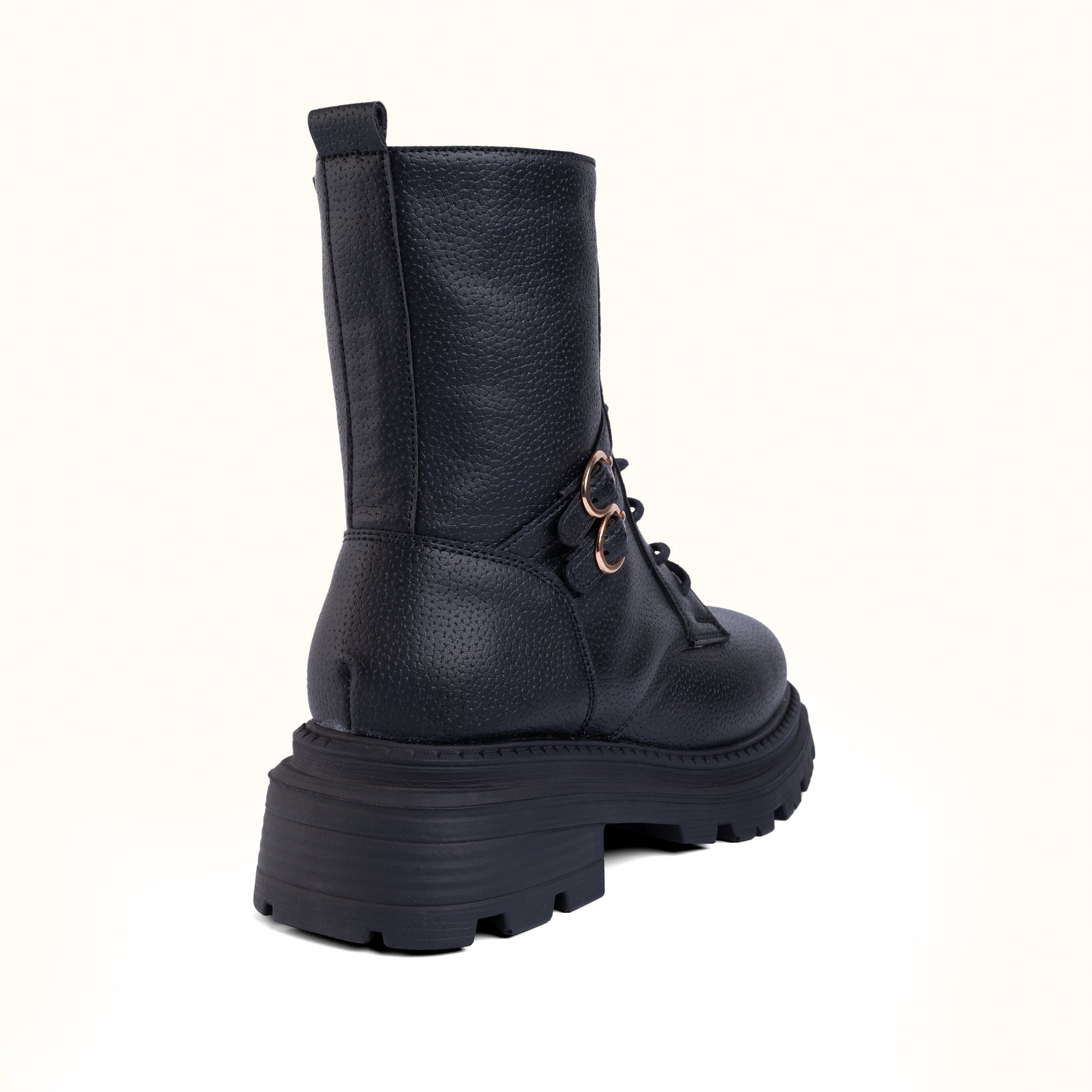 BLACK leather boot featuring a sleek and modern design. The boot has a thick sole that provides comfort and support, as well as a lace-up closure for a secure fit. The boot is adorned with two gold-colored buckles that add a touch of elegance, in addition to an inner zipper for easy wear and removal. This boot is an ideal choice for a modern and distinctive look.